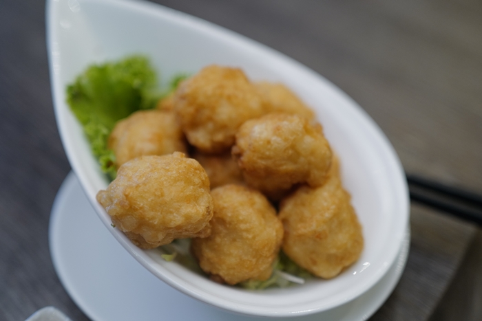 一開頭就是珍饈四小彩蝶,算是開胃小菜,潮州蝦棗熱呼呼入口,可以吃到蝦肉的彈牙,外皮炸得恰到好處,好吃! |