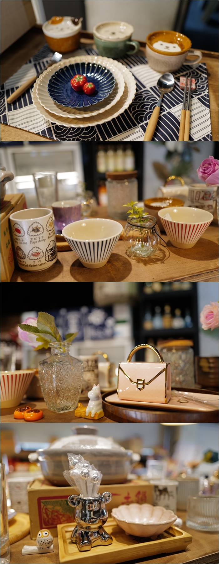 | 走進店內有更多的寶可以挖,店內的氣氛跟裝潢一整個就是日本復古雜貨風格,一邊全部都是日本陶磁碗盤商品,每次近來這種店裡都會失心瘋,看了一輪老闆的價格真的很划算,跟百貨公司比起來便宜一半以上。 |