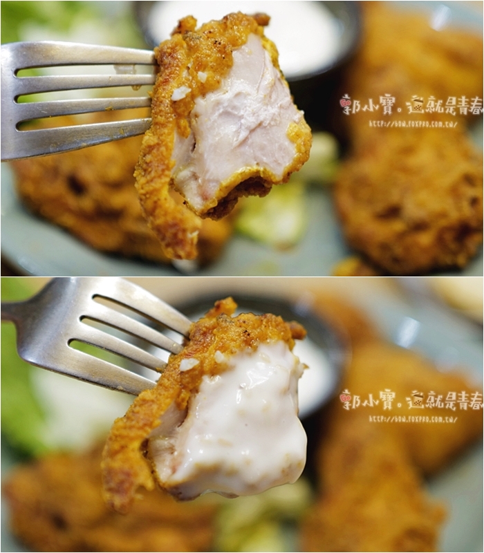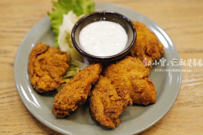 | 附上的沾醬有點像是優格,酸酸甜甜的還滿對女孩子的胃口,酥炸的外皮不會過厚,些許肉汁,整體上還不錯。 |