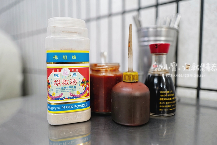 | 每個桌子都有調味料,現在北部幾乎都是統一在醬料桌,只有回南部才會有每個桌子都有調味料這種福利了,其中胡椒粉還是佛祖牌的老品牌,佛祖牌不知道跟新竹佛祖牌米粉是否同一家公司,上網一查,夭壽,2015年的時候有新聞報導佛祖牌胡椒粉是黑心食品,嚇得我默默把胡椒粉推走! |