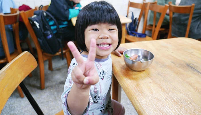 | 餐點不論是飯、麵或是湯都是用不鏽鋼隔熱碗裝,連小朋友的餐具也是不鏽鋼製的,乾淨衛生又不容易被燙到,看我女兒吃的多開心XD |