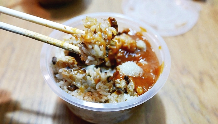 油飯蒸的恰到好處,搭配上甜麵醬跟蒜泥,一口吃下去精神都好起來了。 |
