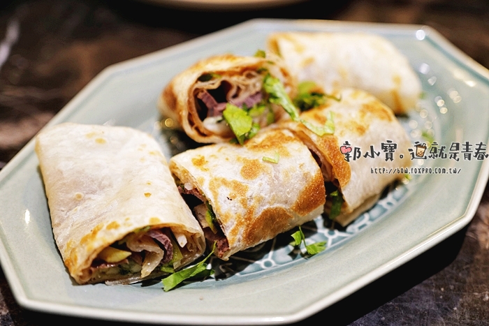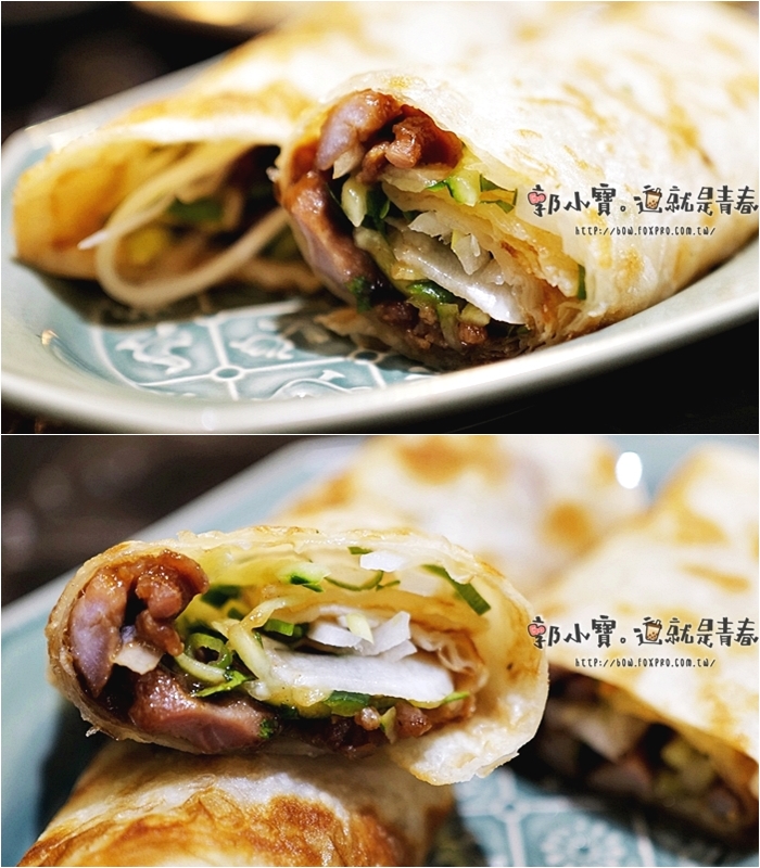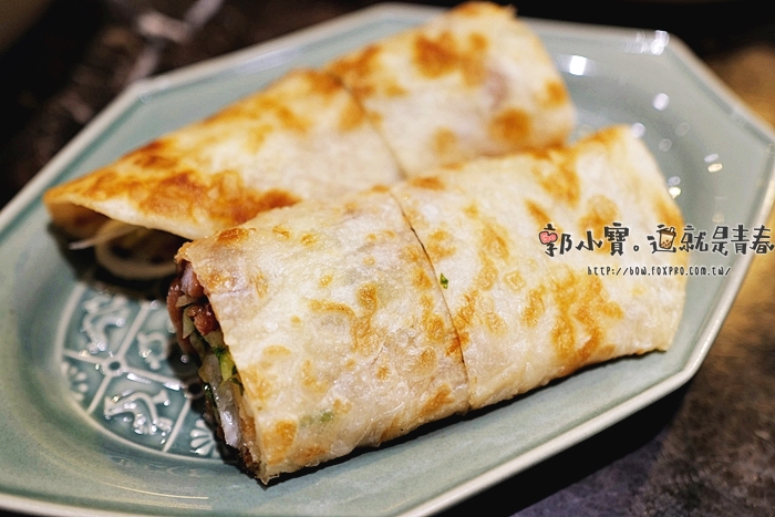 | 豬肉的捲餅也很驚艷,這豬肉絲條的調味我超愛,很像是京醬肉絲的調味,大配榨菜跟小黃瓜絲的脆度還有水分,咀嚼起來的滋味無敵美好。 |