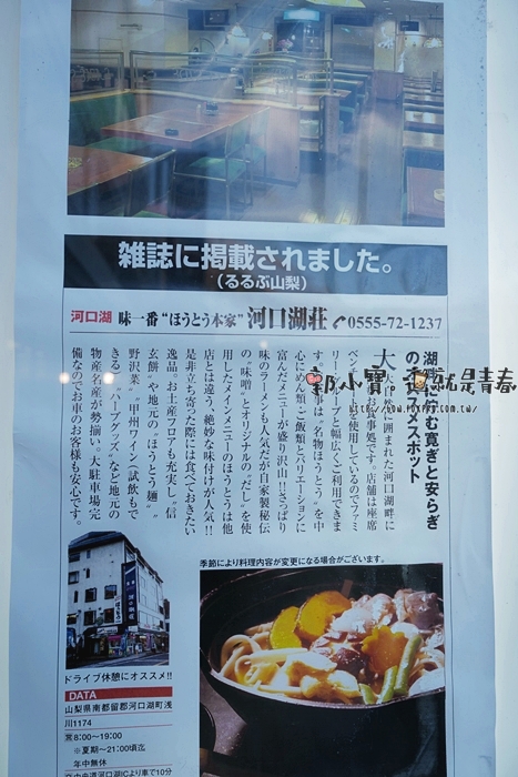 ‧您所在的位置: 郭小寶。呂小珊。這就是青春 > 郭小寶全省食況轉播 > 日本美食景點輕旅行.桃太郎行程精選 > 『食記美食。山梨河口湖』天上山 河口湖荘|在地名物餺飥麵(ほうとう)|味噌野菜湯頭超美味
