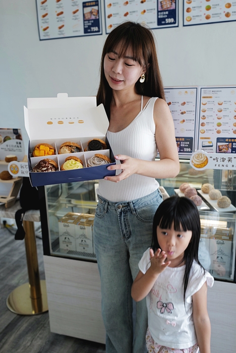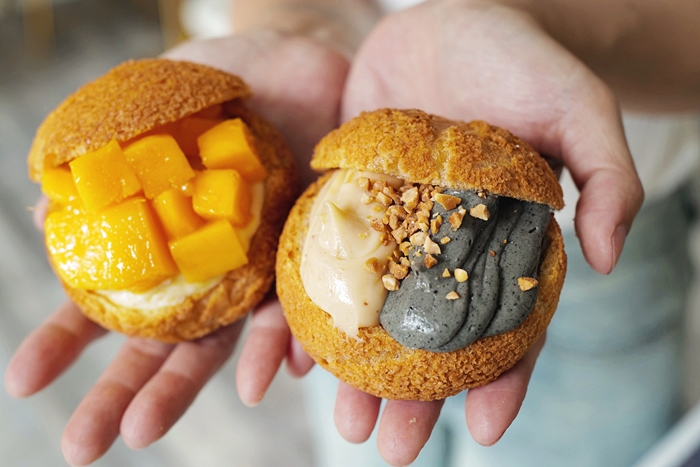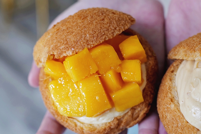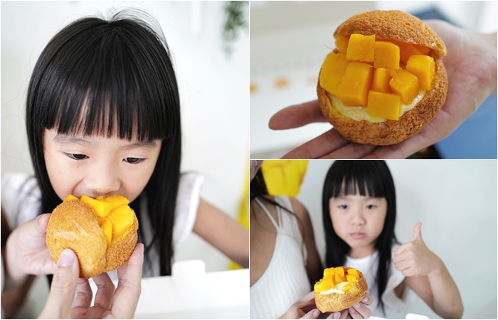 | 季節限定的芒果菠蘿泡芙千萬別錯過,菠蘿泡芙最驚豔的口感就是跟日式泡芙不太一樣,外層酥酥帶點脆度的彷彿像是餅乾薄皮一樣,菠蘿皮的口感非常討喜,加上新鮮芒果的香甜真的太爽了,連我女兒都覺得超美味,重點是芒果底下鋪的生乳醬超濃郁,難怪鳳甜烘培的泡芙可以讓那麼多喜愛,果然名不虛傳! |