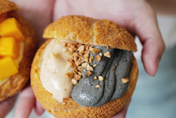 | 花生芝麻的滋味也很特別,花生跟芝麻本身就是各自口味較濃的味蕾,現在直接放在同一顆泡芙,加上上面灑的花生顆粒,入口的口感層次增加許多口感,濃郁的花生芝麻醬意外的搭。 |