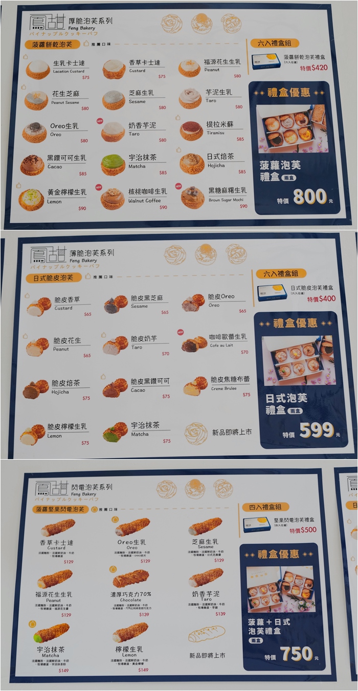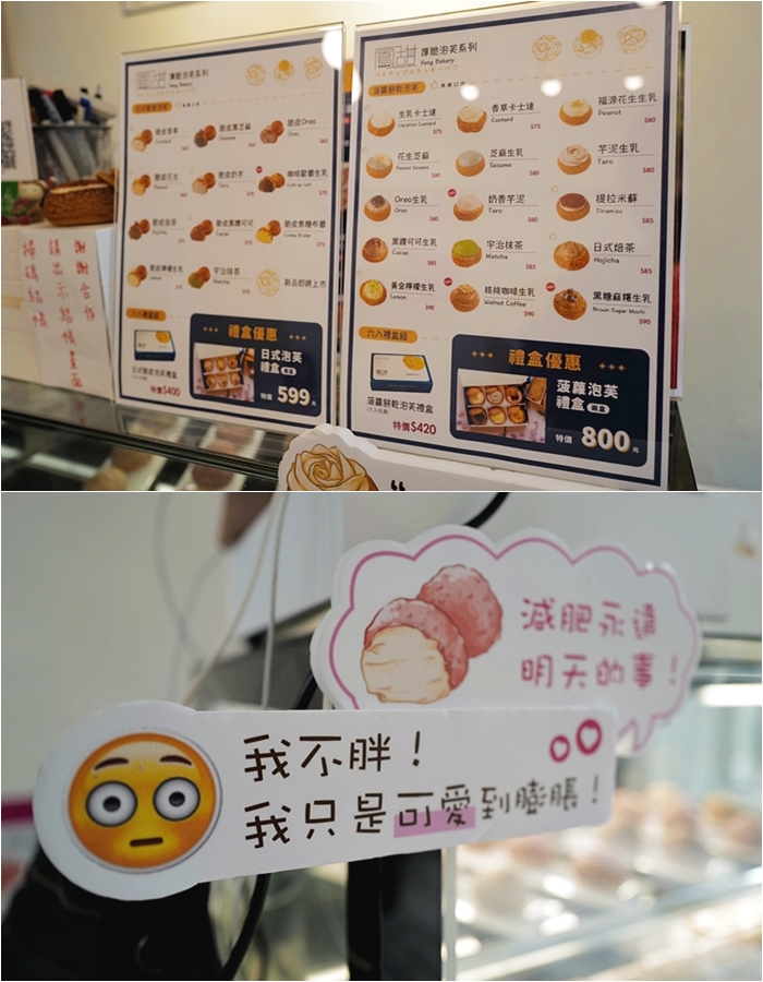 | 最主要的泡芙有日式泡芙、閃電泡芙以及鳳甜的招牌波蘿餅乾泡芙,價位的部分都在跟市售泡芙差不多的價格,主要之前看介紹都是稱讚鳳甜的泡芙真材實料,所以對價格就沒有太多的懷疑。 |