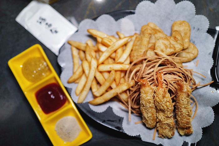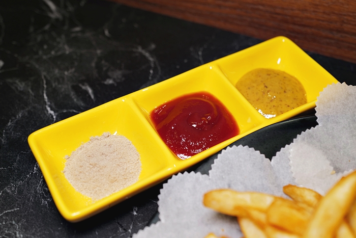 | 直接附上三款醬料,胡椒鹽、番茄醬跟黃芥末醬,炸物拼盤是一訂要點的,喝啤酒就是要搭配炸物拼盤,加上炸物也是小朋友一定要吃的食材,很好拐小孩XD |