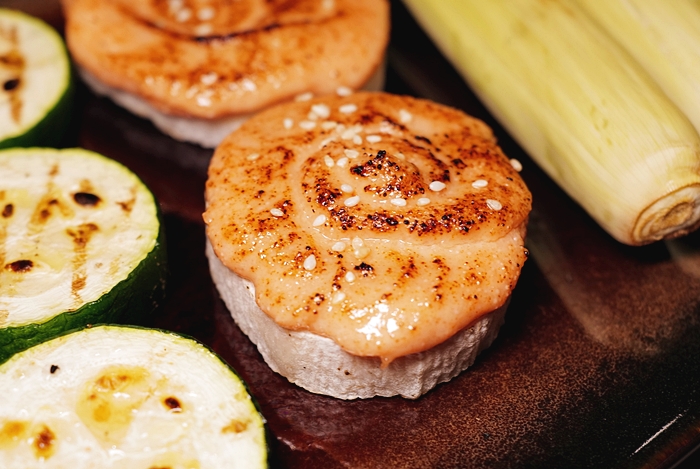 | 明太子烤山藥也要推一下,明太子美乃滋很厚,搭配下方一樣厚切的山藥切片咬起來口感非常飽滿,濃郁的明太子山藥跟淡雅的山葉真的很速配!! |