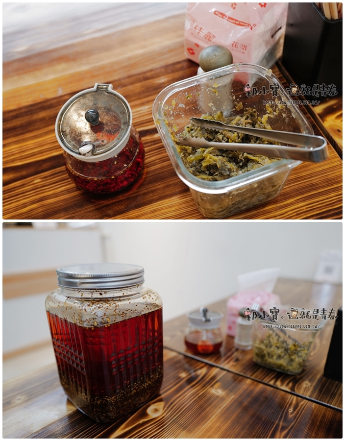 | 桌上擺放著店家自製的酸菜跟辣椒油,剛好看到老闆娘抱著一大罐辣椒油再逐桌補油,瞬間就覺得不淡定了,這辣椒油跟酸菜馬上引起我的興趣。 |