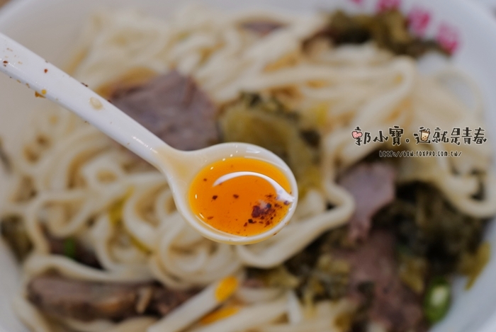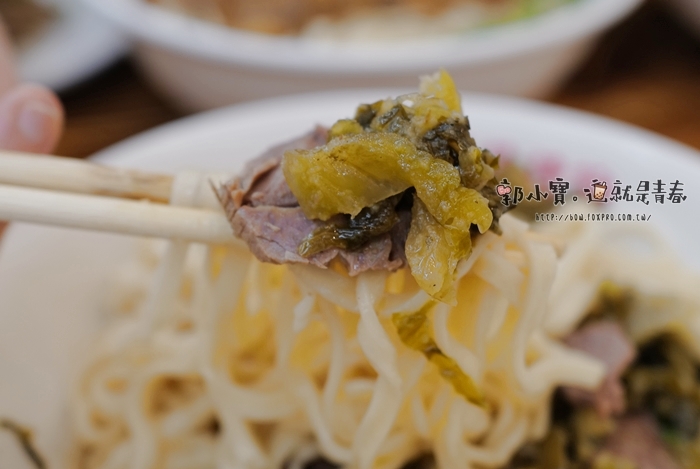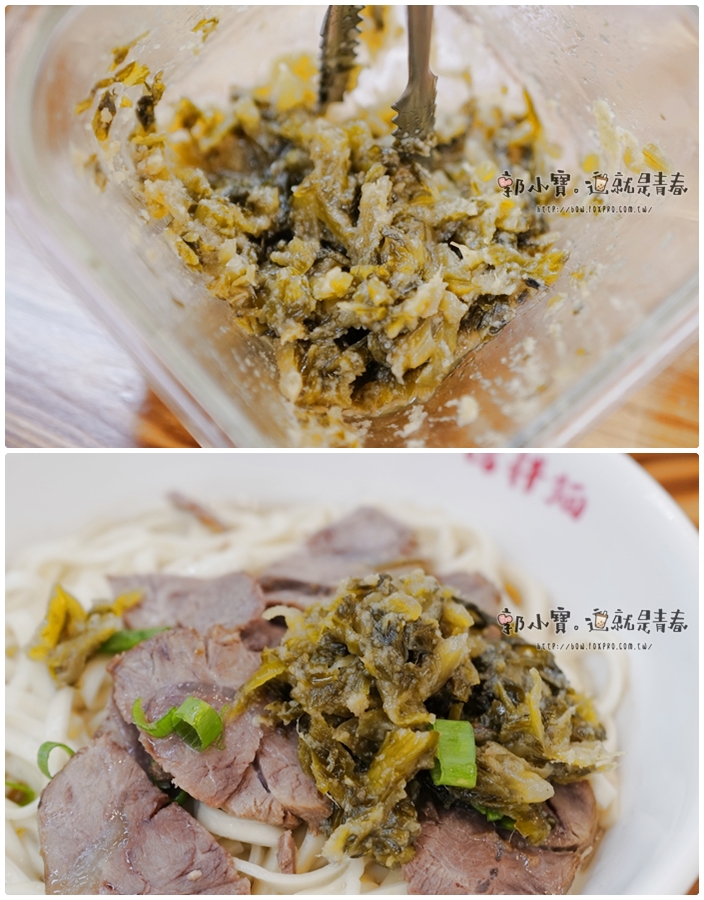 | 酸菜也頗為特別,酸菜看起來跟一般牛肉麵館的酸菜也不一樣,裡面似乎還有薑泥,一震淡雅的薑味飄散出來,這酸菜確實特別,加了薑泥的酸菜基本上都要每天新鮮現做,隔夜薑泥就會有異味,瞬間讓我挖出一大杓添加到我的拌麵裡。 |