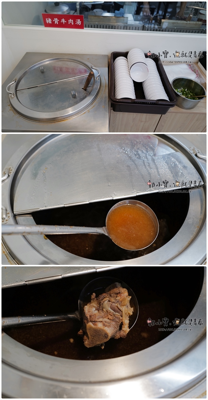 | 湯頭喝起來很不賴,大骨湯頭的鹹鮮滋味帶點牛肉的奶香味,非常順口,湯品非常的清,看來老闆就連免費的湯也濾的頗為乾淨。 |