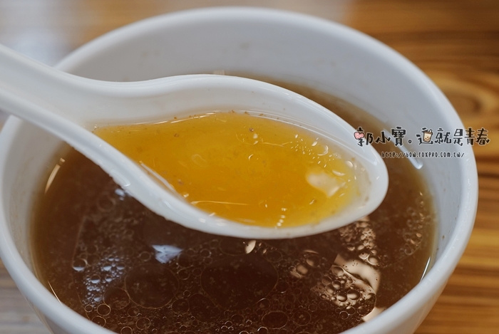 | 非常推薦的點還有店內用餐可以免費享用老闆熬煮的暖湯,舀起一杓看到湯色就知道真材實料,使用熬煮的牛肉的湯頭加上豬骨持續熬煮出來的湯頭,因為店內都是販售拌麵,像我喜歡喝湯的人也不用擔心,還有美味的湯品可以享用。 |
