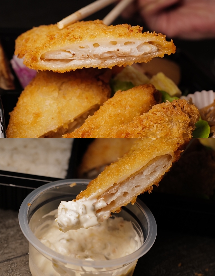 | 炸鱈魚便當就危險一點,鱈魚肉較少一點,中間似乎有起司,一口咬下好像只有咬到麵衣的感覺,不過凱薩醬調的很好吃,且炸鱈魚吃起來也不會滿嘴油,這一點滿厲害的。 |