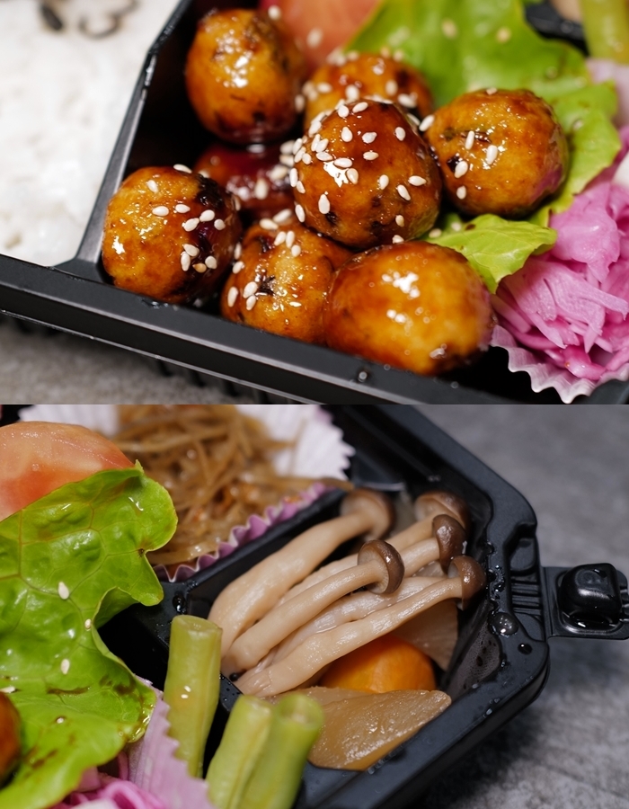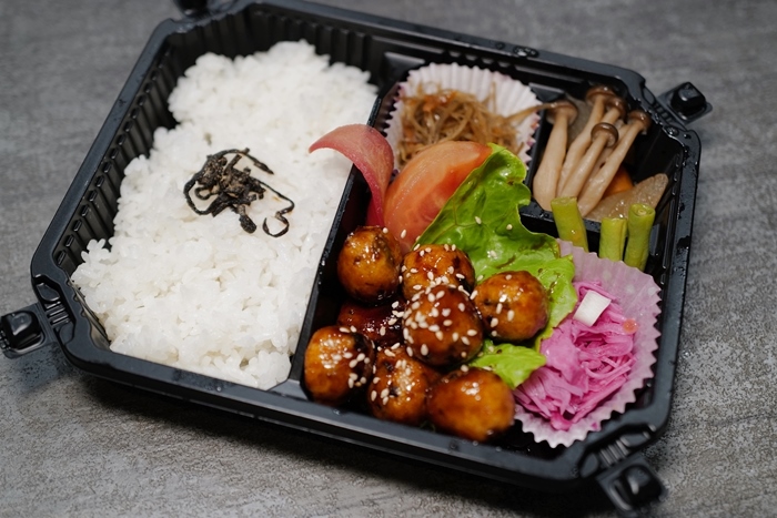| 素食便當的配菜也相當豐富,素食雞肉丸子的口感一點都吃不出來是素食,非常好吃的素食便當。 |