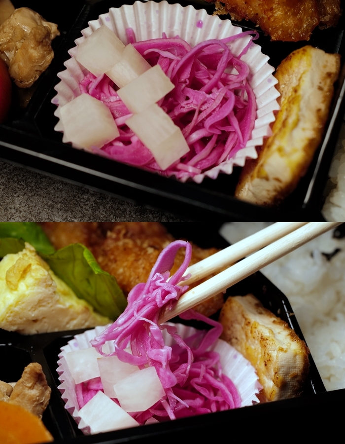 | 甘醋紫高麗菜的口感爽脆可口,搭配醃漬白蘿蔔讓整體的口感大加分。 |