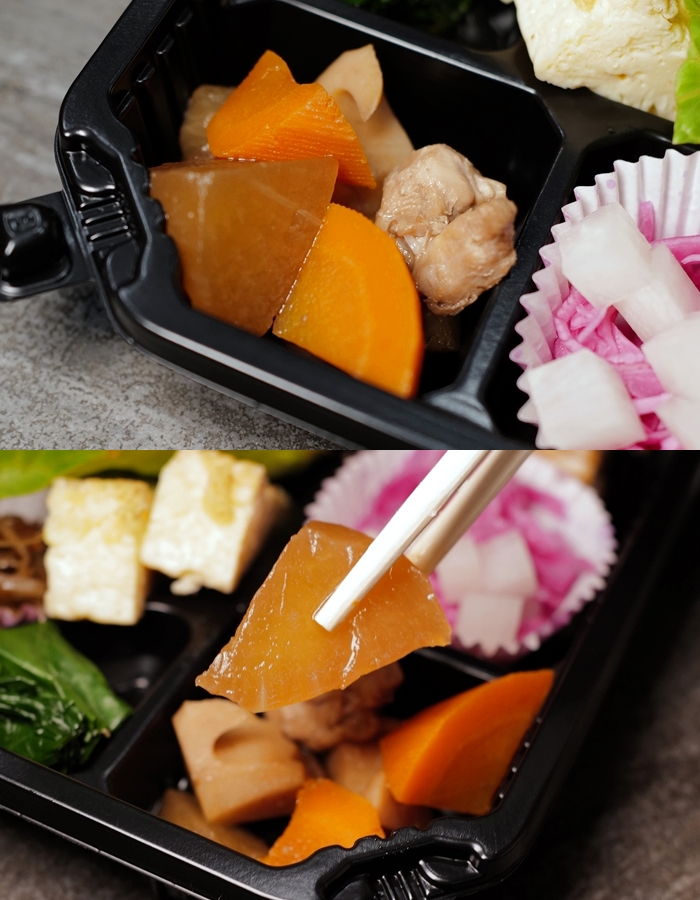 | 日式燉菜的部分也燉紅白蘿蔔、雞肉、蓮藕、雞腿肉、香菇等菜色,口味是偏甜的甘露主醬油味,很適合女生的胃口。