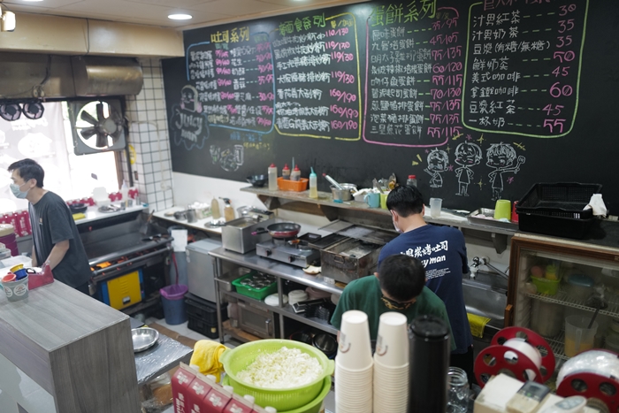 | 汁男碳烤土司看起來是由一群年輕人一起經營,當天生意不錯,三個人忙進忙出的,汁男不只經營早餐,營業到下午三點算是把早餐、早午餐到下午茶都包辦了。 |