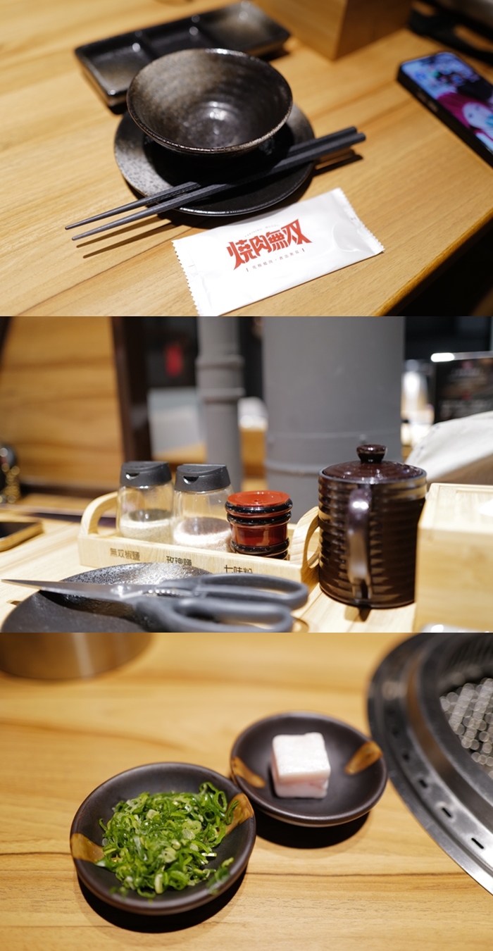 | 燒肉無雙的器具用的都還不錯,幾乎都是瓷器餐具,無美耐皿餐具,調味料跟油壺都擦拭的滿乾淨的,蔥花切的也很漂亮,豬油也給的很肥。 |