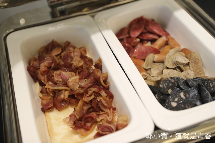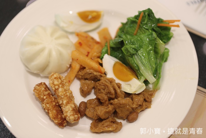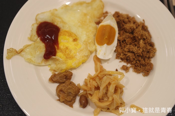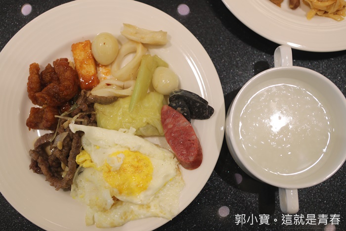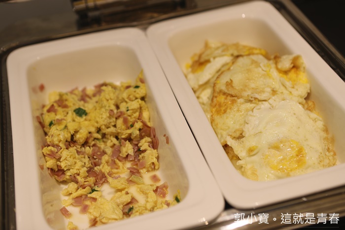 | 這次我第一次在商務飯店裡面吃得那麼過癮的,應該說今天早餐推出的菜色一整個都是我的愛,光肉品就好幾樣了,炒青菜也是我愛的,還有鹹蛋也是我一定會夾的,幾乎每一種我都有夾上一點。 |