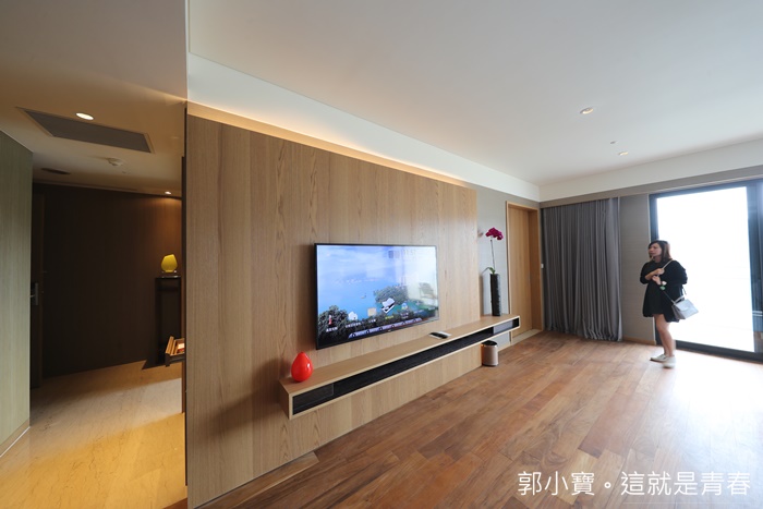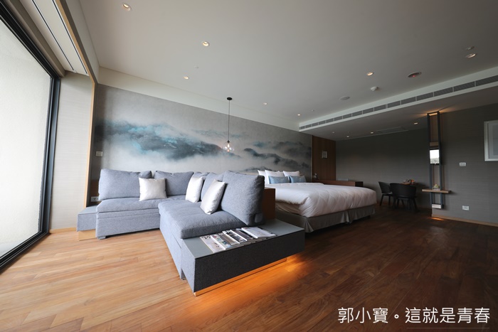 | 行政套房果然非常大,光是房間就一整個可以連翻好幾個跟斗的空間了,床舖旁邊放的是L型的大沙發,面對窗外的湖景顯得更加悠閒,床的背板是山水雲間的畫作,彷彿就在人間天堂般的愜意,木質地板踩起來非常舒服,床鋪對面就是壁掛的大電視,不管在空間上還是設計上還有採光度都非常棒。 |