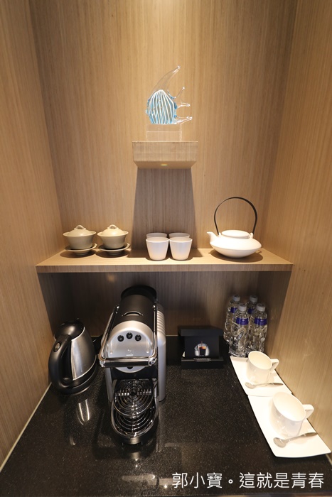 | 茶水櫃除了膠囊咖啡機以外也有準備四瓶礦泉水,不夠可以打電話去櫃台請服務人員送過來,茶包搭配的茶壺跟茶杯也都很講究。 |