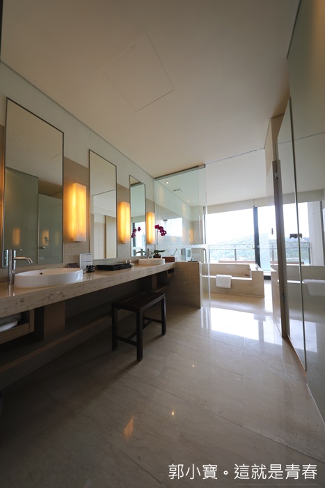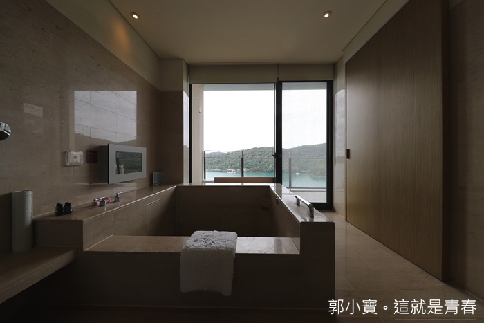| 浴室空間也相當大,最主要的是洗手台的部分是兩個人可以同時用的,屬於長型的衛浴空間,走到底靠近湖面的地方就是石砌浴缸了,浴缸還有配備一台小電視。 |