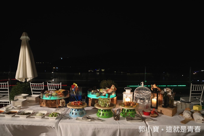 | 夜晚雲月舫早期是經營酒吧為主,因為這個地方真的太有情調了,早上除了是很多人的婚宴拍照及證婚的場地以外,目前雲品將雲月舫設計了晚餐,同樣是自助餐吃到飽的服務,但是這邊主要提供的食材非常高檔,加上氣氛非常棒,所以吸引了不同客群每天訂位,如果是情侶的話,那就真的非常適合了。 |