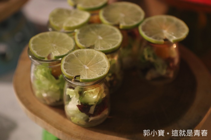 | 生菜沙拉放在玻璃瓶內,擠上幾滴檸檬汁讓人胃口大開。 |