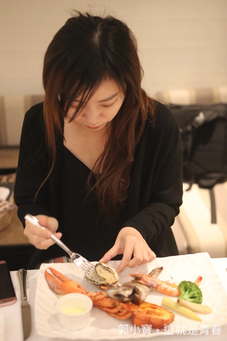| 其實光是自助餐桌上的海鮮就夠我們吃到一個不行了,但是單點菜單裡面的熱菜我們也是點了一大輪,上菜的速度也不慢,瞬間一道道就陸續上來了,看看我們家的太妃吃到一整個兵荒馬亂的XD