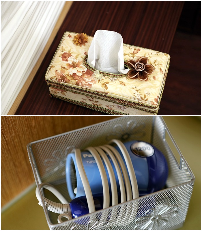 | 吹風機跟面紙盒都在化妝台上,吹風機是小隻的,風力尚可,面紙盒也很華麗少女心XD |