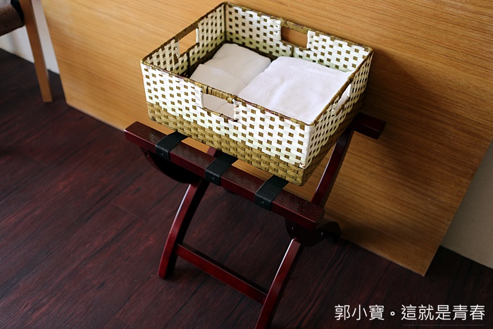 | 每個房間都有行李架,毛巾跟浴巾都會放在竹籃子裡面,毛巾跟浴巾的質感都很好,不會刮肌膚。 |