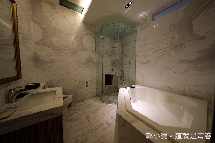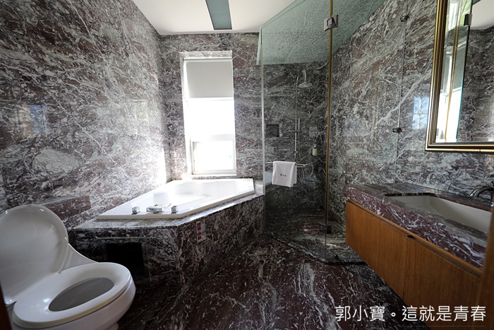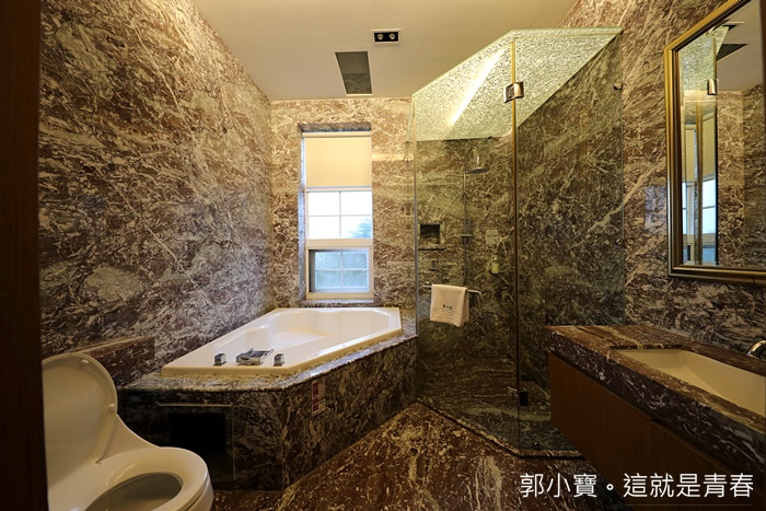 | 打開浴室的門更讓我看傻了眼,這浴室也太美了吧,整間浴室都是大理石打造的,尤其這一間大理石的花色也太美了吧,後來民宿主人開放其他房間給我參觀的時候,這時才發現每間房間的浴室大理石都是不一樣的,而且每一間浴室裡面都有超大浴缸! |