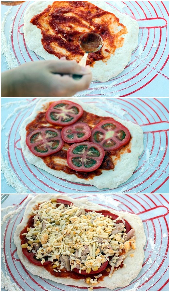 | 塗上番茄醬後再將餡料放上去麵皮上面,盡量撒上妳要的配料不用客氣,民宿主人準備的配料就是要讓妳灑完也沒關係,起司是一定要給他鋪上厚厚的一層的啦! |
