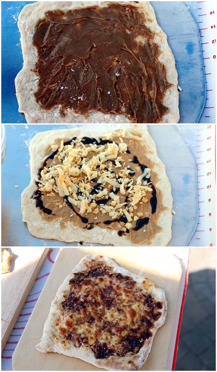 | 我們當天做了兩個披薩,一甜一鹹兩種口味,甜的部分是花生醬加上巧克力醬還有起司,如果是香蕉的產季在放上幾片香蕉應該就更美味了。 |