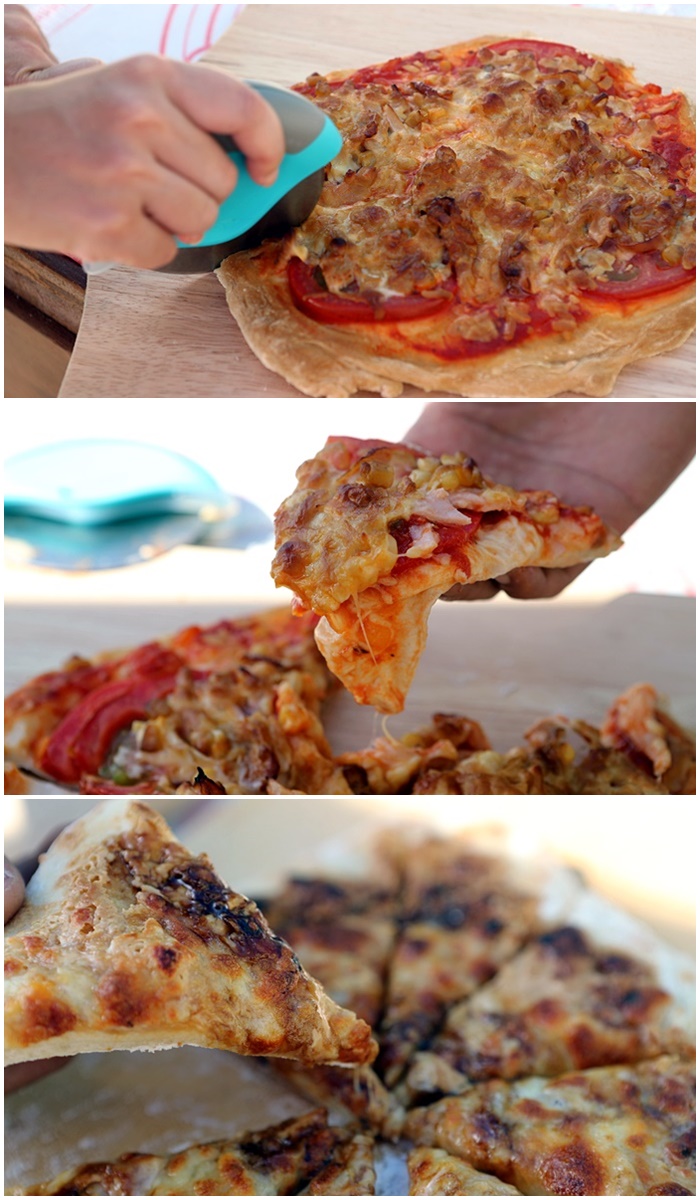 | 連切披薩的滾輪刀民宿主人都準備好了,這披薩真的超好吃的,自己捏的麵團自己烤的披薩吃起來果然味道一整個就是不一樣,難怪每個小朋友來都要自費參加這個行程,真的很有趣,其實翠山莊還有其他DIY的活動,有興趣的朋友不妨打電話去訂房的時候可以問一下民宿主人,因為會依照季節不同而有所變動!! |