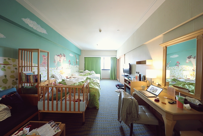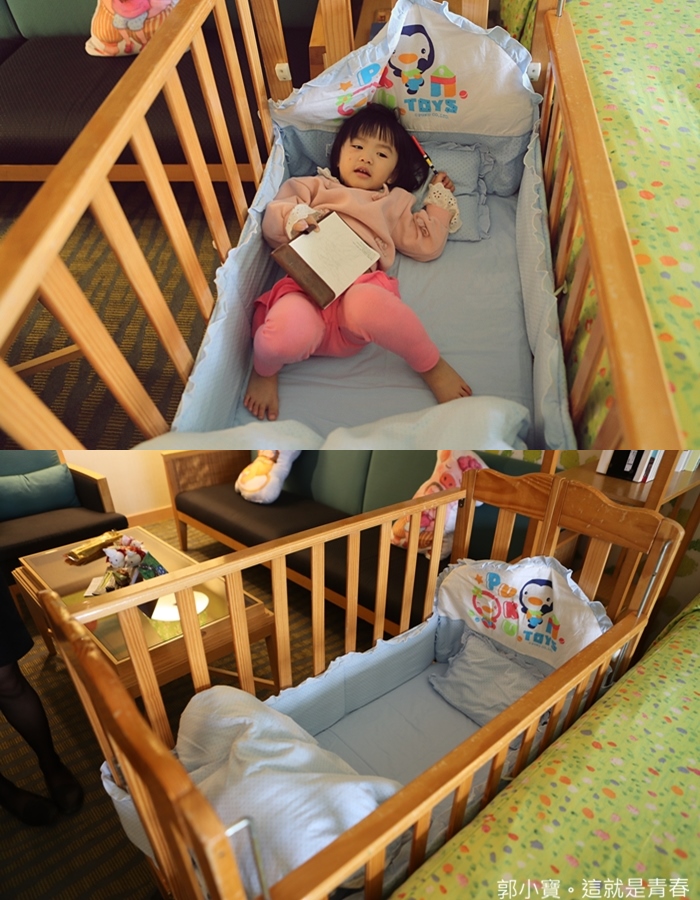 | 如果需要嬰兒床的話在訂房的時候就需要先告知飯店,這樣他們比較好幫忙準備嬰兒床,嬰兒床的單面高度可以升降,方便家長翻身的時候罩看小朋友,我家女兒也很喜歡這個小空間。 |