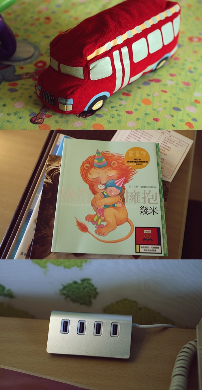 | 床鋪上還有可愛的公車小抱枕,化妝台上還有準備了幾米的擁抱童書,下方也有幾米的書卡,可以進行借閱回房間非常方便,重點床頭櫃還有四孔的USB,這個就真的是必備貼心小物了XDD |