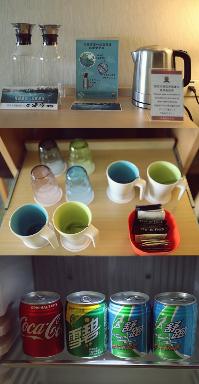 | 茶水櫃沒有提供瓶裝水,花蓮翰品現在致力於環保,所以提供玻璃瓶裝水,每個玻璃瓶裝水上都會標示出哪一天裝瓶,瓶裝水都會天天做更換,基本上很乾淨安全無虞,廁所洗手台內也有專門的過濾水可以去盛裝,杯子也都繽紛繽紛的,冰箱內的飲料是免費提供。 |