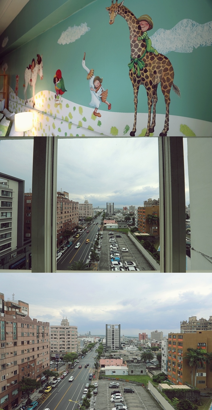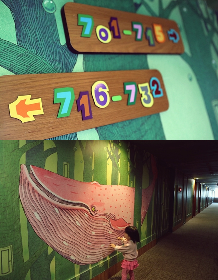 | 我們這次入住的是幾米主題房,主題房的樓層是在7樓,連標示房號都非常可愛,走道上也都是幾米的創作,女兒看到粉紅色的大鯨魚一整個非常開心,在森林裡面有很多海洋生物,且顏色非常繽紛,是一種融合共生的概念。 |