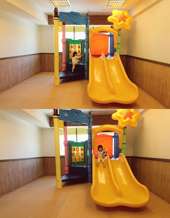 | 旁邊是滑梯球池,我們造訪的時候正當武漢肺炎疫情的期間,所以飯店已經把球池的球都收起來了,不過光是溜滑梯也讓我們家嬰皇很快樂了,終於可以在有冷氣房又不用擔心他被蚊子咬,大家都舒服的溜滑梯XDD |