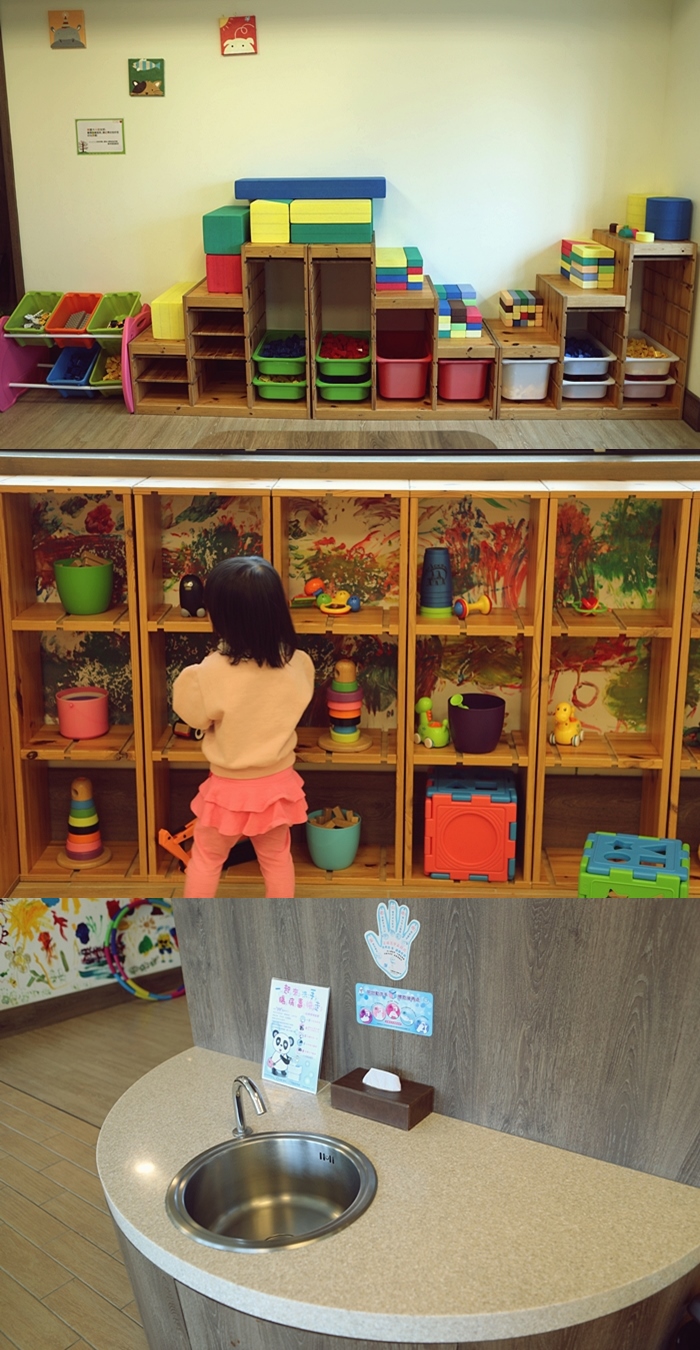 | 中間還有一個洗手台,玩具也都分類的很好,最主要工作人員都會主動幫忙歸位整齊,對於下一個使用者來說也是很好的感受,不管是書籍、積木、教具都一應俱全。 |