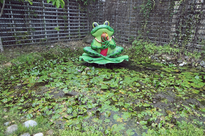 | 特別的是後面竟然還有一個生態池,生態池蓄養的很好,很特別的生態池,且還以青蛙的擁抱主題作為搭配。 |