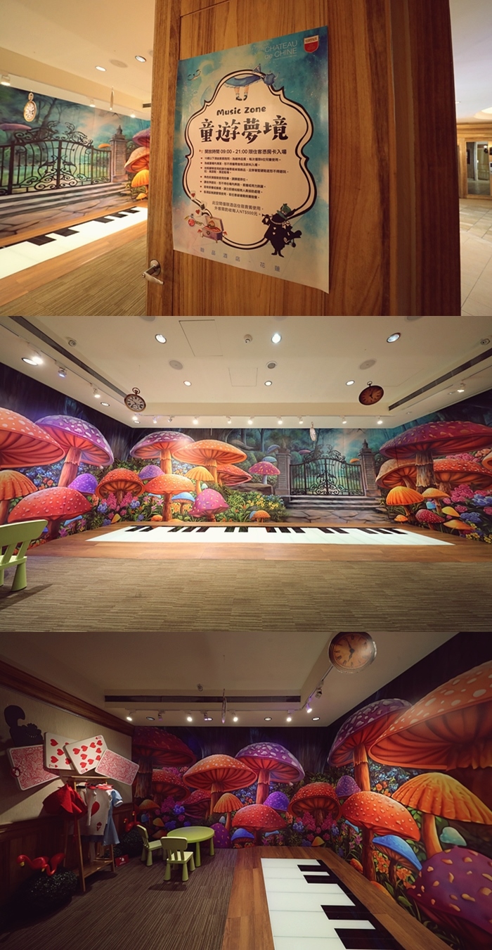 | 花蓮翰品大廳旁就有一個童遊夢境,都還沒辦好入住手續嬰皇就瞬間被吸引走了,裡面風格彷彿來到了夢幻的愛麗絲仙境一般,光是在這邊拍照就覺得很漂亮,非常特別的奇幻風格空間。 |