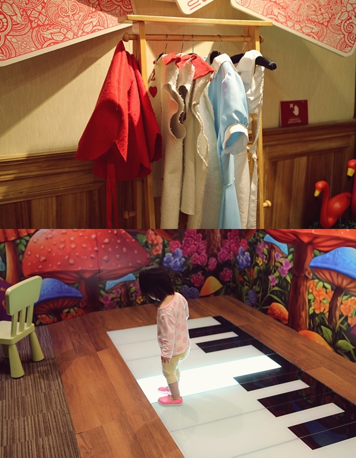 | 裡面有準備很多服裝可以給小朋友角色扮演,地上的鋼琴鍵盤不是只有裝飾,踩在上面是真的可以發出鋼琴聲的,非常有趣,小朋友真的很容易被聲音吸引,光是這裡嬰皇就已經完到流連忘返,對我們來說超安心,因為以前辦理入住手續的時候,嬰皇都會坐不住四處跑,現在他幾乎窩在裡面不出來,我們也可以安心辦理手續。 |