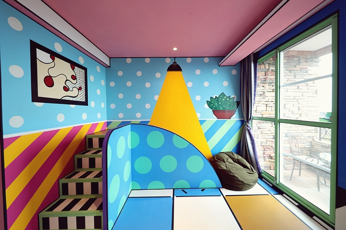 | 整間房間真的很繽紛,主題相當明顯,難怪可以那麼受歡迎,本來打算兩天都睡這間,但是因為這次有六間主題房,我們一家人去住兩個晚上,所以就決定每天都要換房間感受一下不同的氣氛。 |