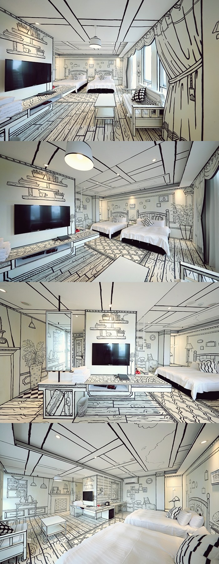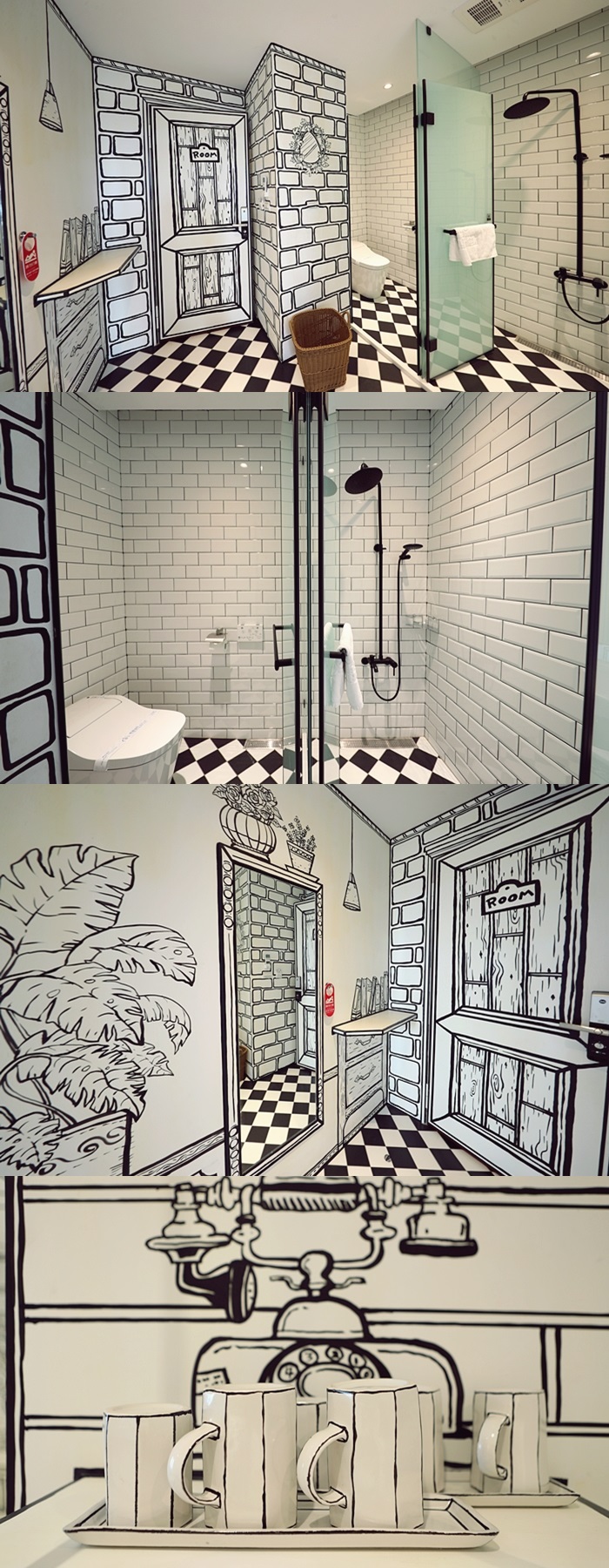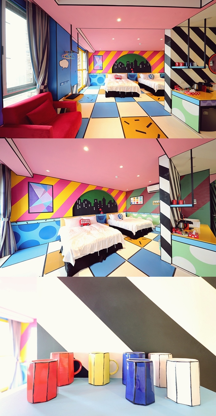 | 每個地方都很讓人覺得不可思議,據說這房間很多地方都是闆娘跟員工親手繪製的,即使住在這邊一整個晚上後,早上起床看到這房間還是覺得很神奇,讓我想起了韓劇的W,真的進入到漫畫的世界了,這間房間超夯的,不只整個房間都呈現2D畫風,連很多器具像杯子也都特別繪製出2D感。 |