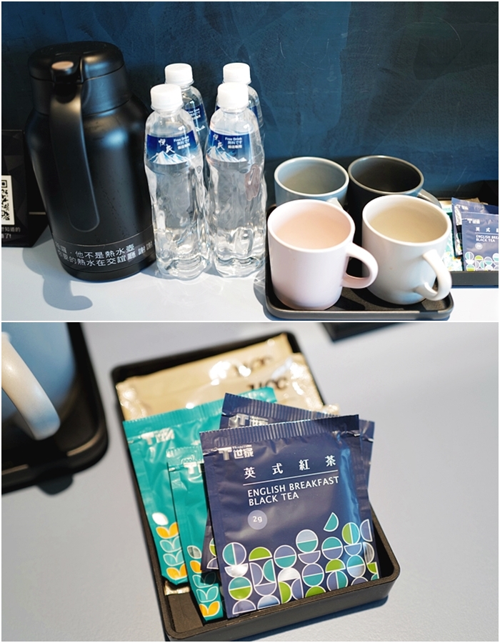 | 剛剛有提到,房內沒有電熱水瓶,只有保溫壺,可以去交誼廳裝一壺熱水回來放著,房內有提供礦泉水,杯子是大耳的馬克杯很實用,提供的茶包、咖啡包感覺也都不錯。 |