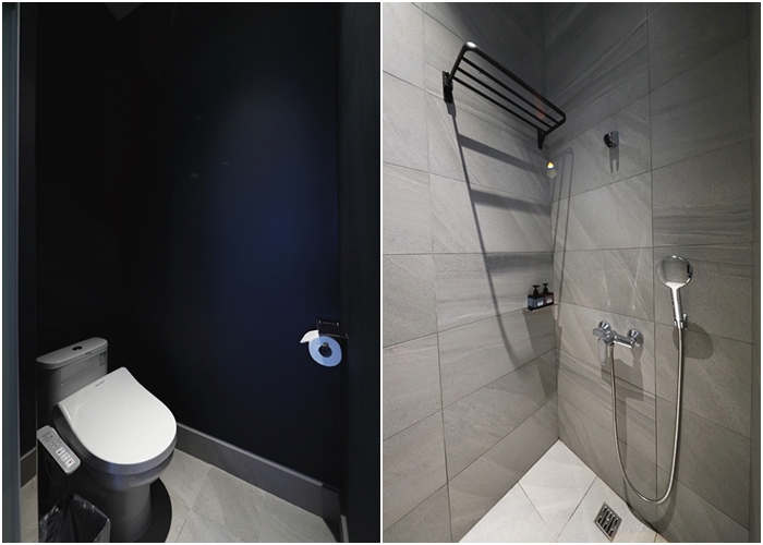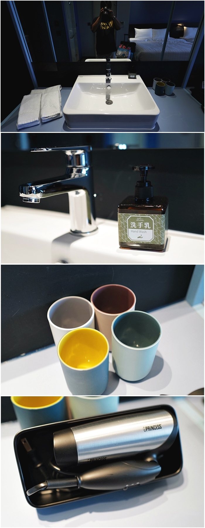 洗手台直接坐在浴廁外,盆子的高度算高,水龍頭打開水花也不會濺出,備有洗手乳,吹風機比較小台,長頭髮的女生可能吹頭髮會比較費時一點,OA HOTEL 房內沒有提供牙膏牙刷,有需要可以去櫃台索取。