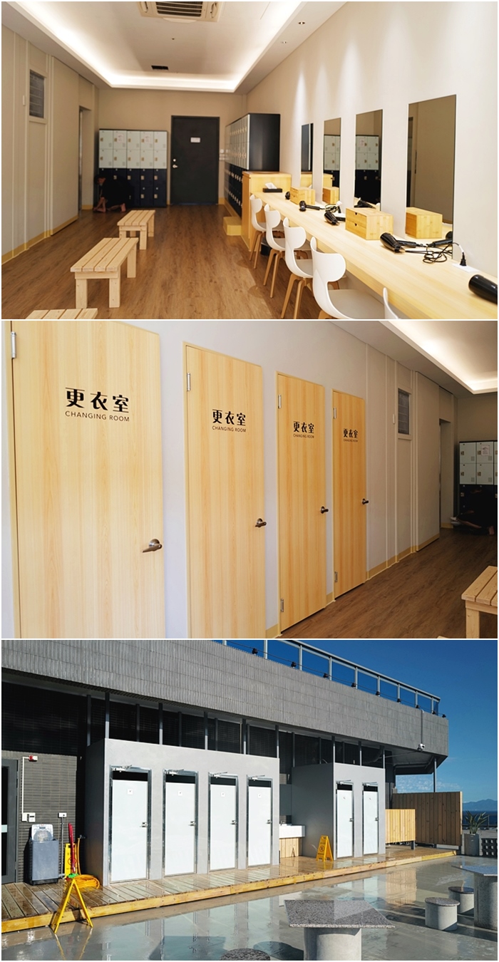 海景風呂還有更衣室、梳化桌椅跟淋浴室,現場有櫃台跟服務人員,也有提供毛巾。